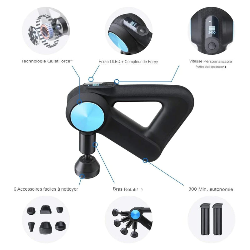 Approuvé par les athlètes : pistolet de massage par percussion portable, conçu pour un soulagement optimal des tissus profonds et des douleurs musculaires. Un massage 60 % plus profond que la majeure partie des pistolets de massage qui permettent de soulager la douleur.