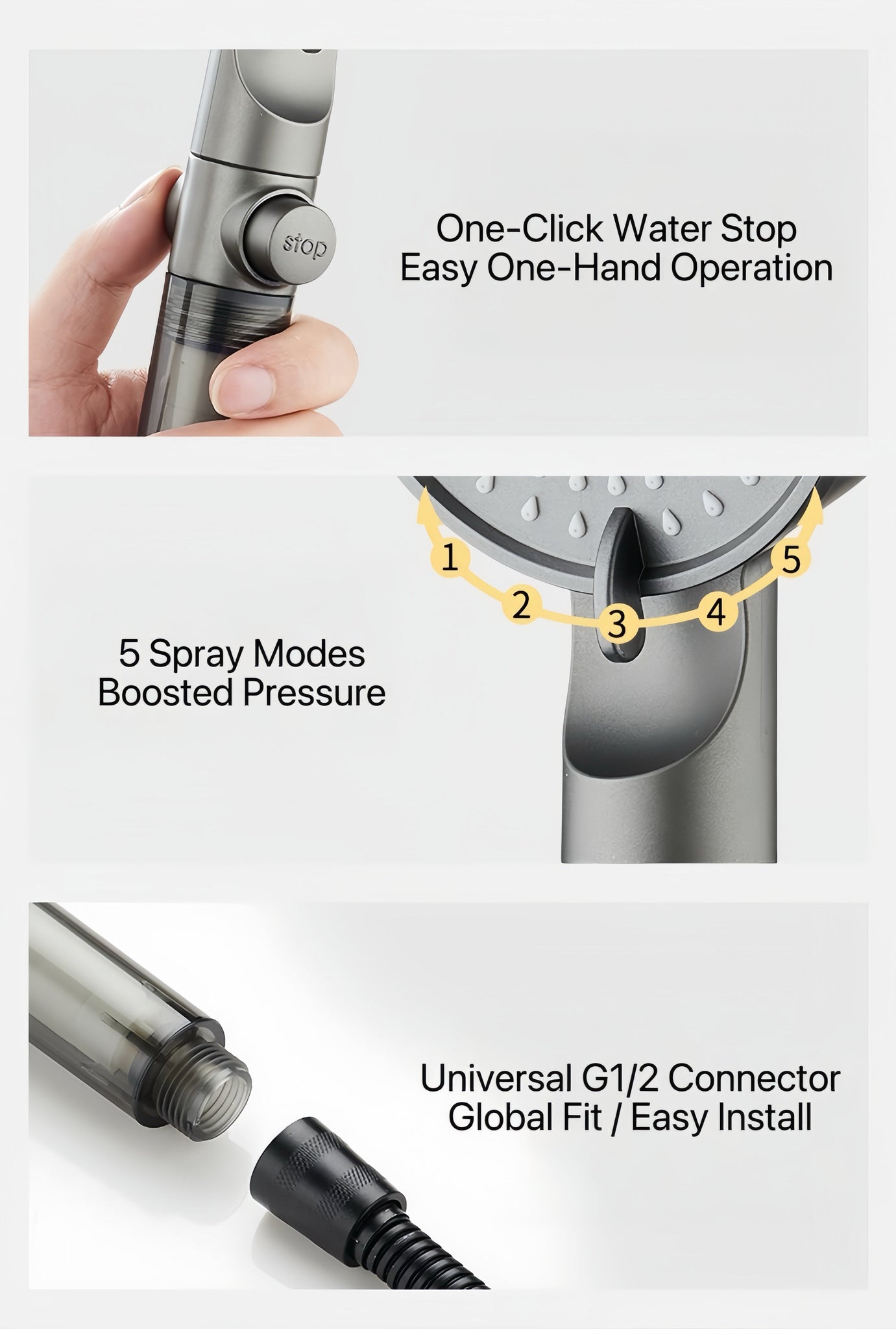 Le bouton stop à une touche vous permet d’interrompre instantanément l’eau — idéal pour se rincer, se savonner ou économiser l’eau. Grâce à sa conception en ABS épaissi et résistant, ce pommeau est fait pour durer.