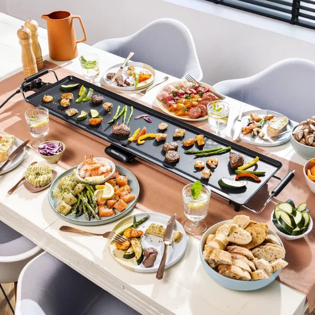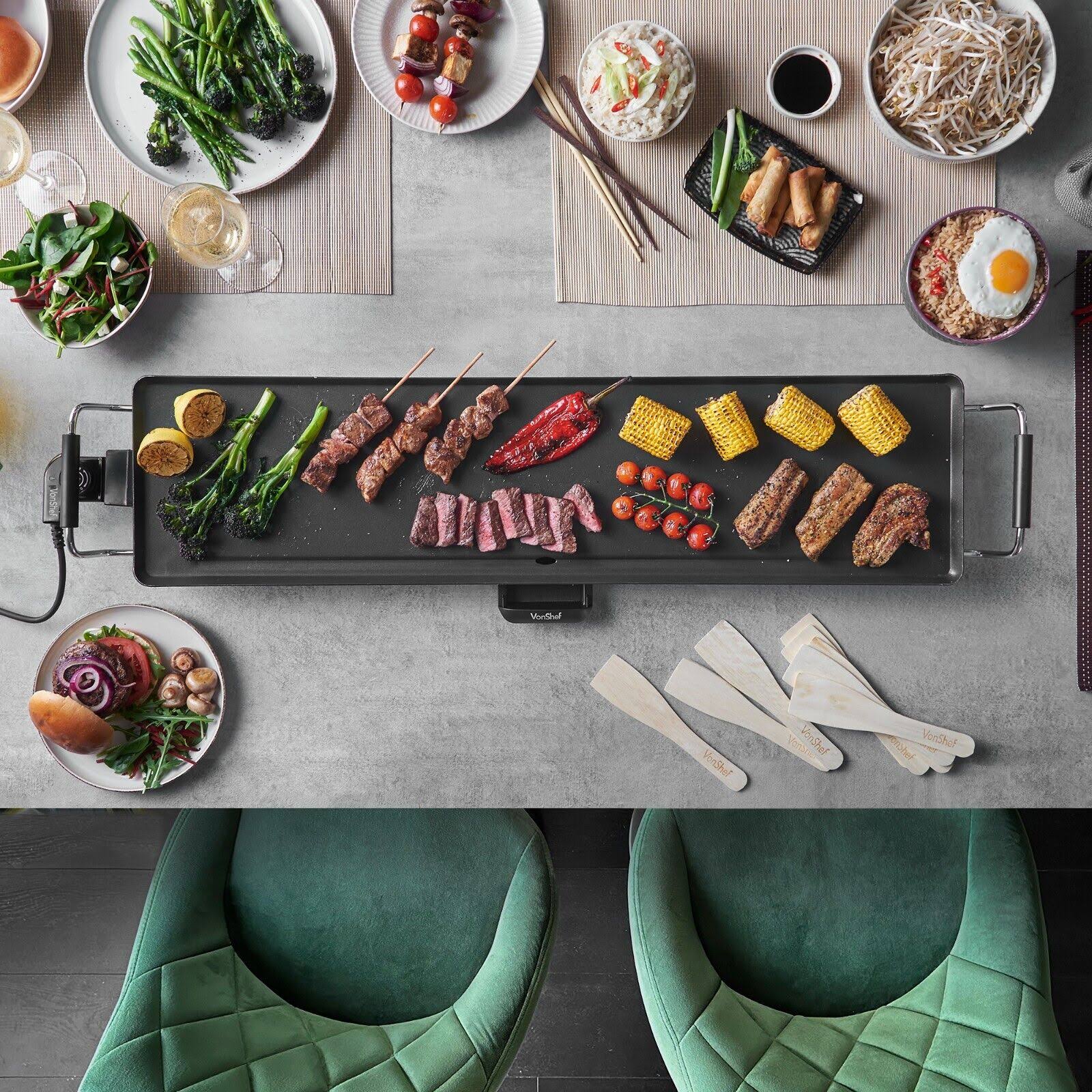 SERVEZ VOTRE CUISINE DIRECTEMENT À TABLE : Grâce au thermostat et au cordon détachable, vous pouvez servir la plaque Teppanyaki directement à table à la fin du processus de cuisson, permettant à vos convives de choisir parmi les différents plats fraîchement préparés.